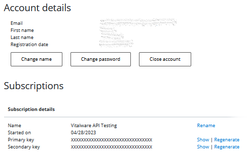- You will see that the subscription has been granted primary and secondary keys which you will